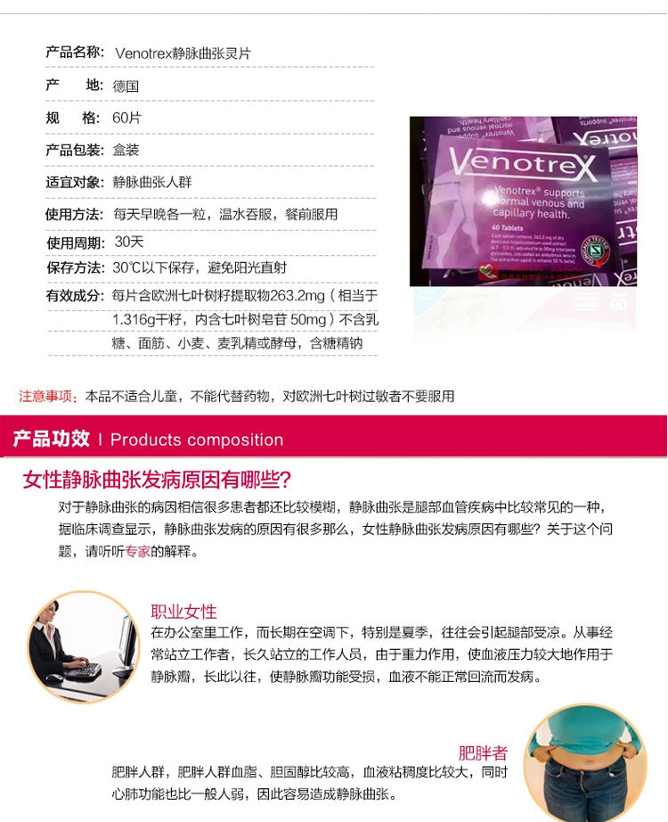 【产品名称】 Venotrex 静脉曲张灵片 缓解浮肿 伸张血管 60片