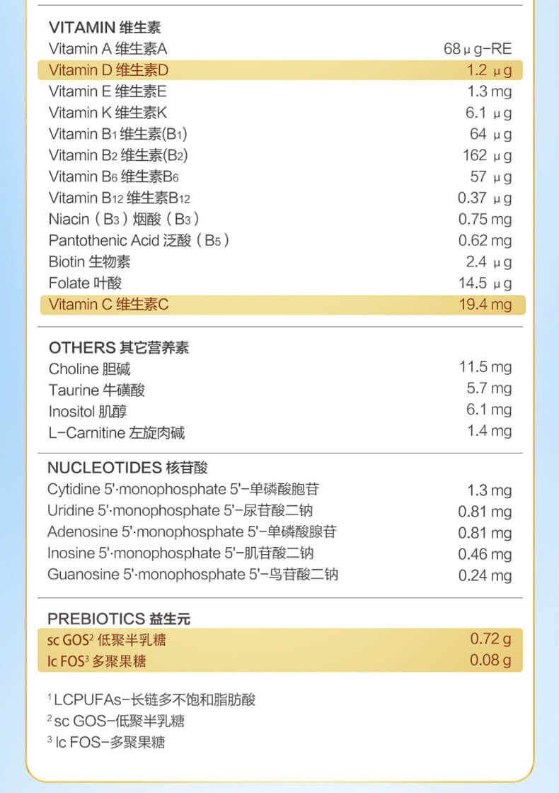 脱脂奶粉、去矿乳清、乳清乳糖、乳清蛋白浓缩、大豆油、乳类寡糖、葡糖糖、果聚糖、Omega3和Omega6、鱼油、GOF/FOS、磷脂、维生素(A, B1, B3, B6, B12, C, D, E, K1)、beta胡萝卜素、维生素H、钾、钙、钠、铁、锌、镁、铜、锰、硒、核苷酸等