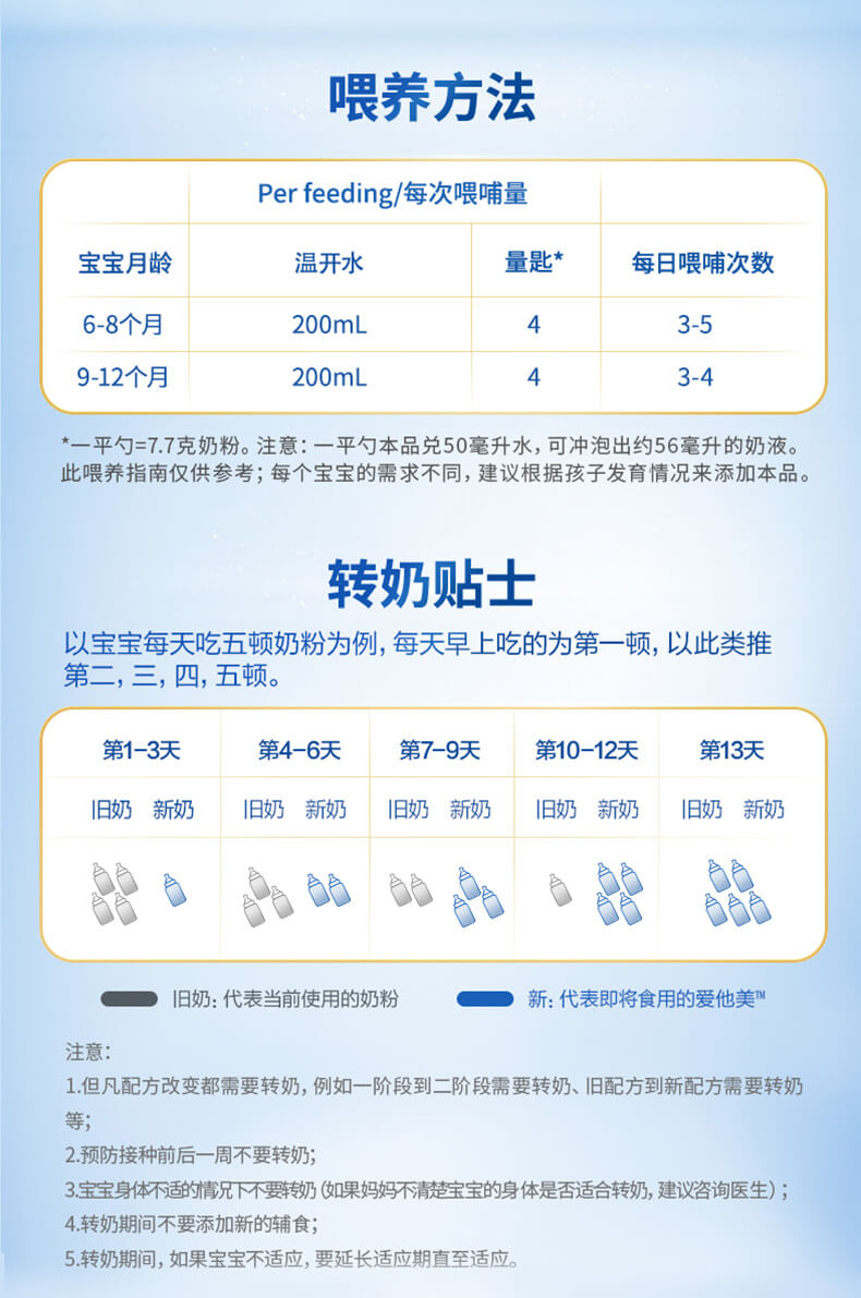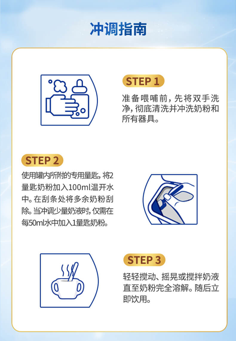 ★备注: 在50毫升的水中加入1勺奶粉大约提供55.7毫升的总量不要保留剩余未喝完的配方