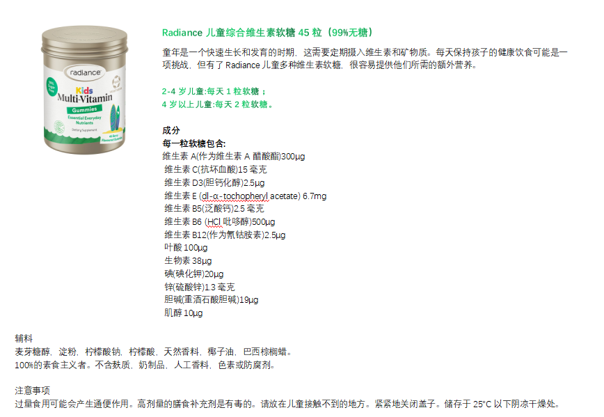 Radiance 儿童多重维生素软糖 45粒-保质期-2026.06