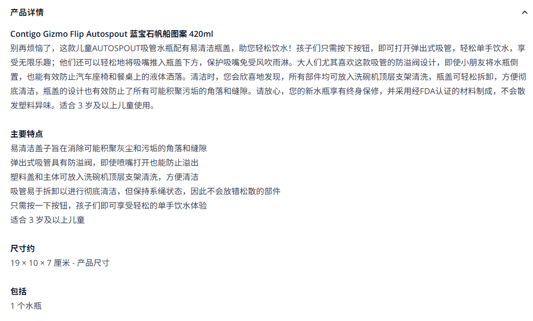 > Contigo 儿童饮水壶 蓝宝石帆船图案 水杯水瓶 414ml