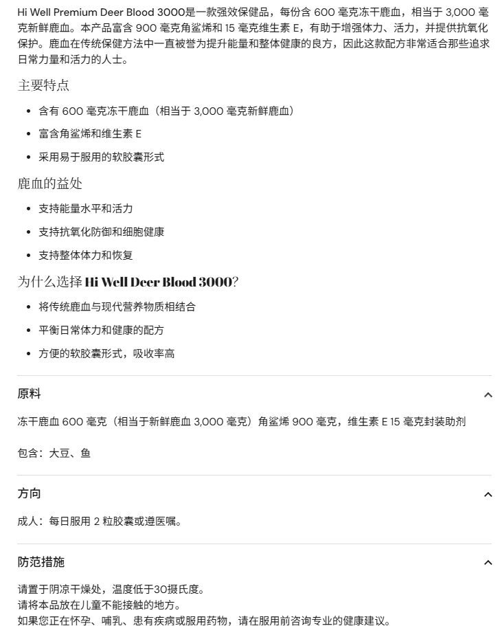 > Hi Well优质鹿血3000+角鲨烯和维生素E 500粒软胶囊 EXP.2028.05